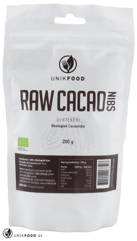 Cacao nibs er små stykker af cacao-bønnen. Cacao nibs er velegnet til flere ting. Vi bruger dem f.eks. i vores smoothies, hvor de giver lidt knas at tygge på. Brug dem på morgenmaden, i müsli, desserter, eller bag med dem.