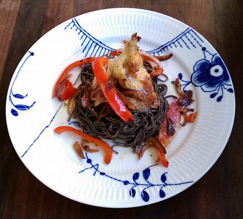 - Skær peberfrugt og løg i strimler og sauter dem på panden. Finsnit hvidløg og en smule chili (frisk eller tørret) og sauter med på panden med salt og peber.
