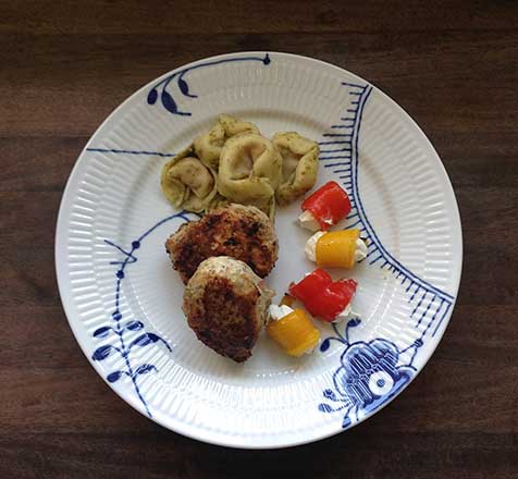 På billedet er frikadellerne serveret med ovnbagt peberfrugt rullet med flødeost.
