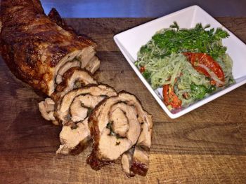 - Bland brun farin, stødt rosmarin, salt og peber i en skål og fordel det på kødstykket.