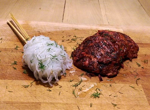 3. Varm panden op og sæt en gryde over med let saltet vand, hæld lidt olie på panden og læg derefter små ”bøffer” af rødbedemassen og steg dem ved svag varme til de er gennemstegte.