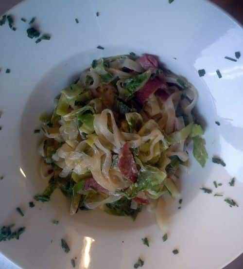 - Hæld vandet fra pastaen og vend det med bacon og kål.