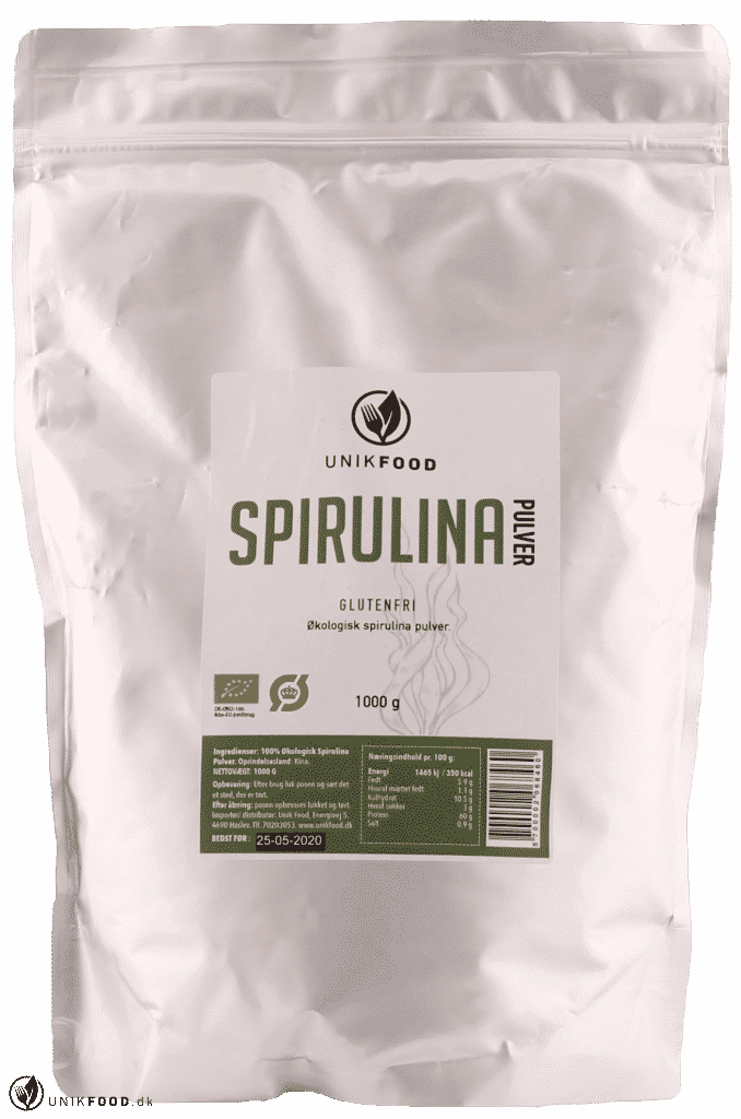 Økologisk ferskvandsalge (Arthosira Platensis) som indeholder protein, aminosyrer og vitaminer.